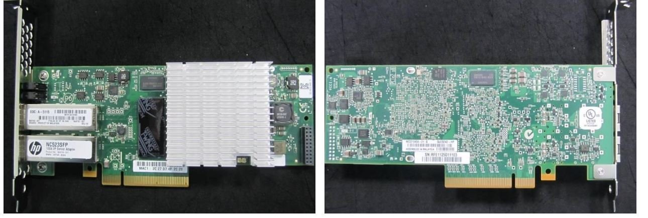The NC523SFP is an eight lane (x8) PCI Express (PCIe) 10 Gigabit network solution offering superior bandwidth in a ProLiant Ethernet adapter. This dual port PCI Express Gen 2 adapter supports SFP+ (Small Form-factor Pluggable) connectors, requiring either Direct Attach Cable (DAC) for copper environments, or fiber transceivers and fiber cables for fiber optic environments. The NC523SFP ships with advanced server features that ProLiant customers have come to expect, such as support for TCP checksum and segmentation (LSO) offload capability, VLAN tagging, jumbo frames, IPv6, and more. Flexible to order and install, the NC523SFP can be used in either standard or low profile slots.
